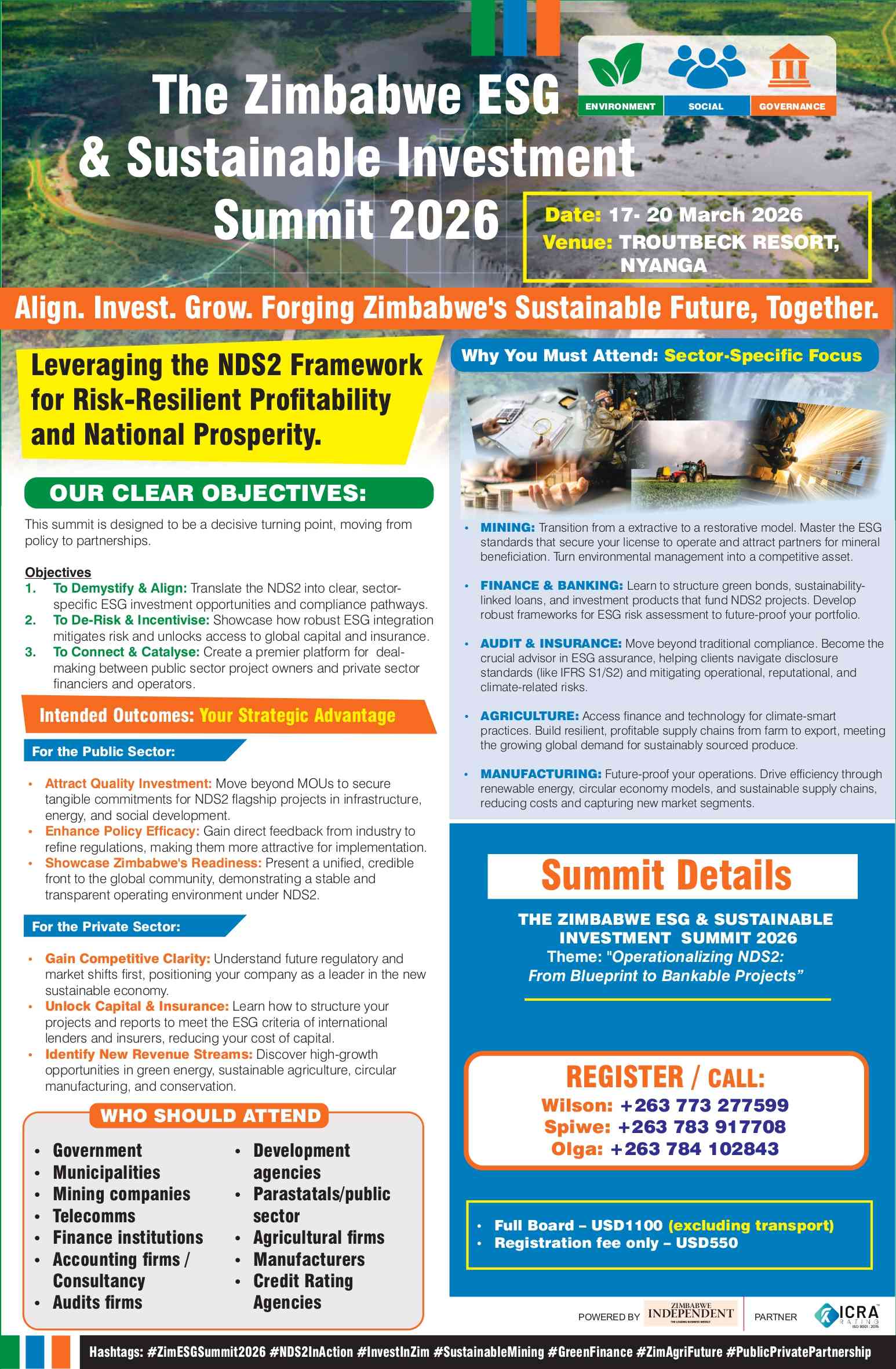 The Zimbabwe ESG & Sustainable Investment Summit 2026 will run from March 17 to 20 at Troutbeck Resort in Nyanga under the theme “Operationalising NDS2: From Blueprint to Bankable Projects.”