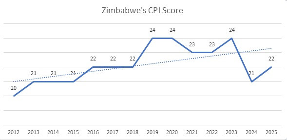 Between 2012 and 2025, Zimbabwe recorded a modest but notable improvement in its Corruption Perceptions Index (CPI) score, rising from 20 to a peak of 24. This gradual upward movement reflected incremental progress in strengthening public-sector integrity frameworks, albeit within a context of uneven and often incomplete reform implementation.