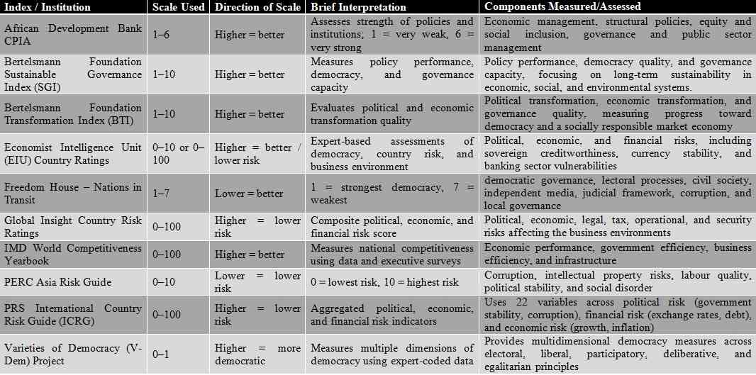 These sources, including international financial institutions, policy research organisations, and private risk assessment firms such as the World Bank, World Economic Forum, and African Development Bank, evaluate risks related to bribery, misuse of public funds, abuse of public office, state capture, and the effectiveness of anti-corruption mechanisms.